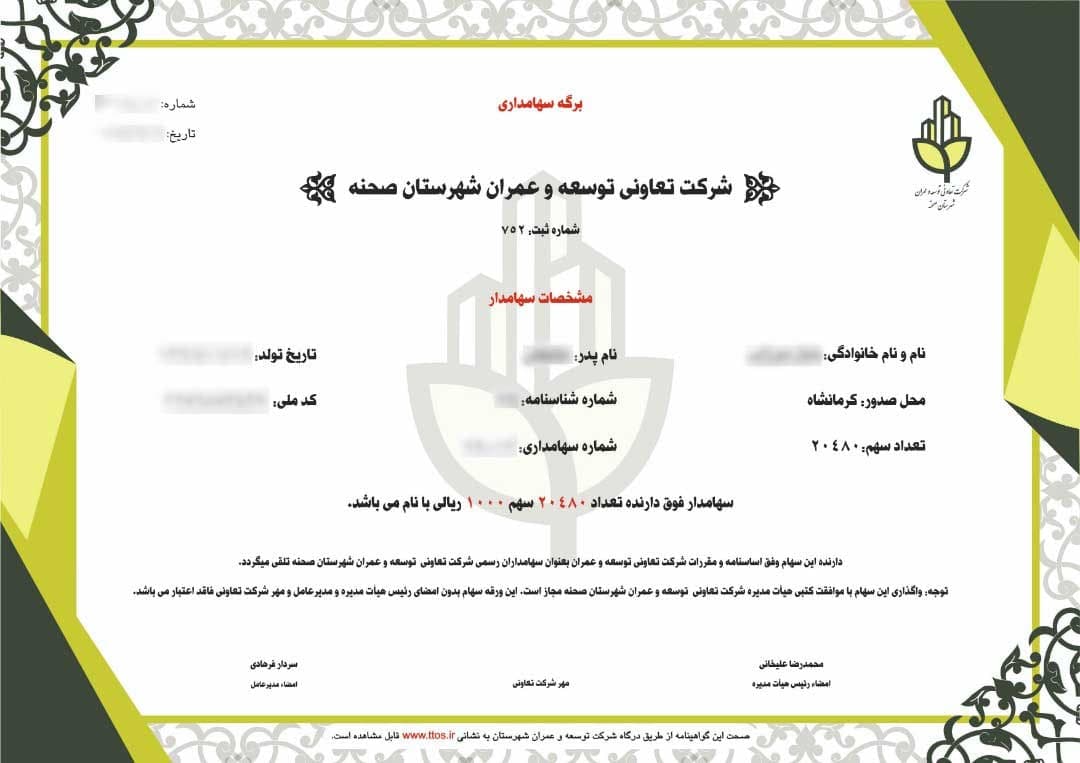 🔺 لازم به ذکر است برگههای سهام، برای سهامدارانی صادر شده است که حق عضویت ماهیانه خود را تا پایان فروردین به صورت کامل (به مبلغ ۲۰،۴۲۰،۰۰۰ ریال معادل دو میلیون و چهل و دو هزار تومان) پرداخت نمودهاند. آن دسته از سهامداران محترمی که تاکنون موفق به پرداخت کامل حق عضویت خود نشدهاند نیز میتوانند ضمن پرداخت بدهی خود، جهت صدور برگه سهام، با تلفن 09929955684 در ساعات اداری تماس حاصل نمایند.